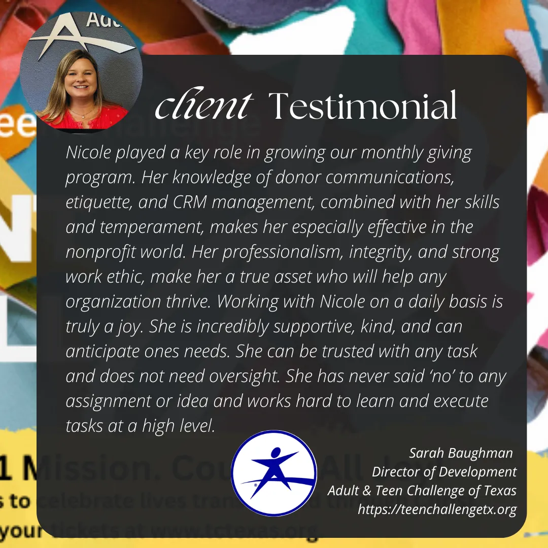 When I worked as Development Coordinator at Adult & Teen Challenge of Texas, I discovered the true power of CRMs. I loved the behind-the-scenes work of organizing donor data, keeping sponsorship programs up to date, and ensuring supporters felt valued.